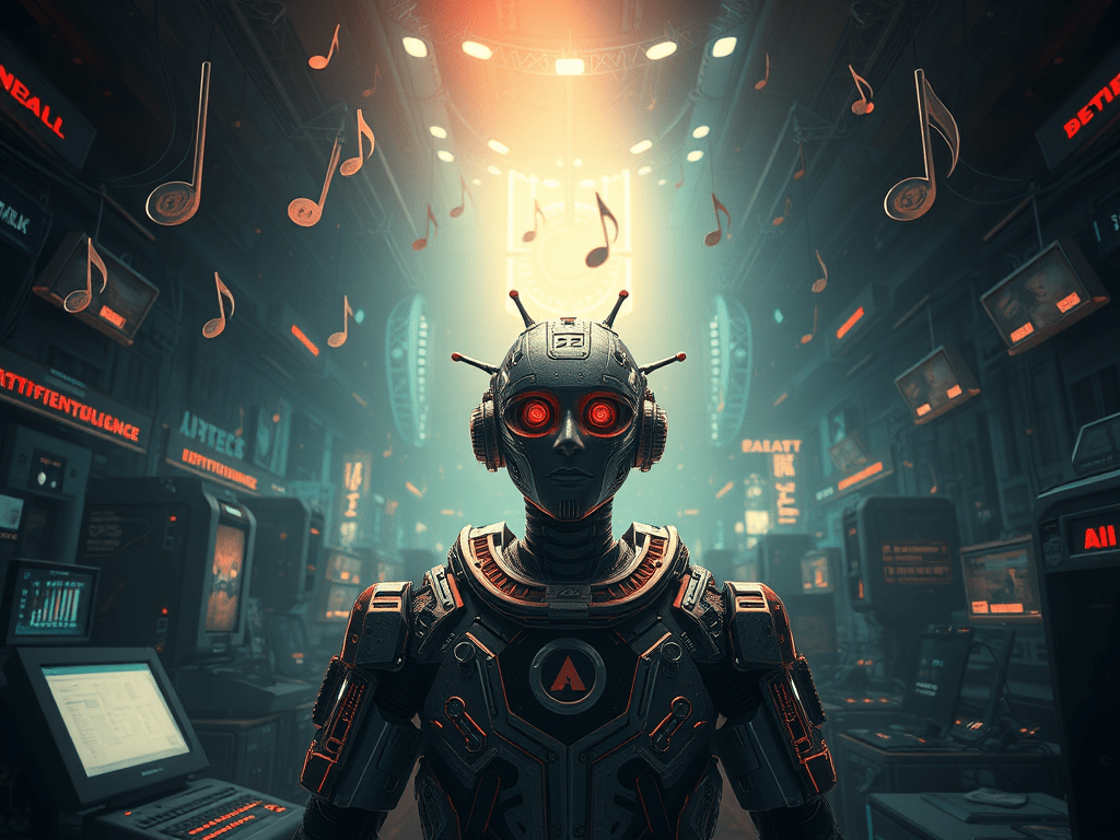 "Create a highly detailed image showcasing the concept of Artificial Intelligence, represented by a central character. The image should depict a futuristic scene featuring a blend of digital art and technology, AI-generated art, and musical notes to represent creativity. Use dramatic lighting to create a dynamic atmosphere, highlighting the contrasts between innovation and ethical concerns. The style should be vintage and cyberpunk to capture the complexity of AI. Ensure high resolution and sharp focus to emphasize details and make the image engaging for tech enthusiasts and skeptics alike."